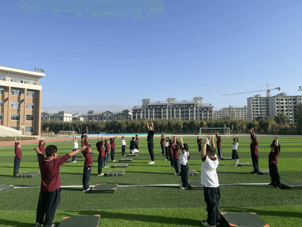 图为杨毅元带领孩子们上体育课